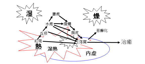 その段階で、内臓の機能活動、気血津液など栄養分の状態は病変の進行に大きい影響を与えます。その段階では皮膚炎症を除く対処と内臓機能の調整、さらに気血津液を補うことなどを並行して行う必要があります。