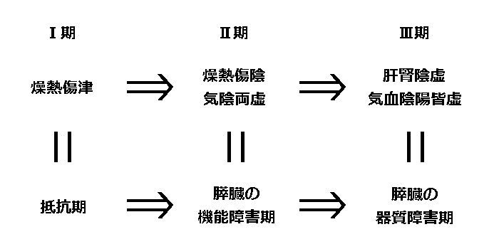 体格正常あるいは肥満、体力中等以上、はっきりした三多症状(多飲、多食、多尿)はない。食欲旺盛、口渇、口乾、口粘。便秘気味。舌紅。脈正常あるいは有力。 | 多食、多飲、多尿、やせ、倦怠脱力、口苦咽乾。便秘。舌紅、苔黄厚乾燥あるいは黄膩。脈数あるいは数無力あるいは洪大あるいは弦数 | 多飲、多尿、食欲低下あるいは多食、体重激減。無力、口乾、便秘、腰膝軟弱、インポテンツ。舌絳紅無苔あるいは舌暗淡、乾燥光苔、脈細数。 |